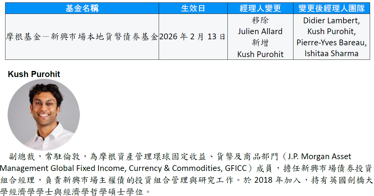 謹通知「摩根基金-新興市場本地貨幣債券基金」經理人於2026年2月13日進行調整如下: