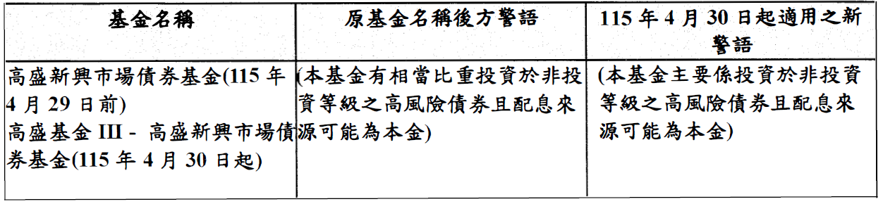「高盛新興市場債券基金」調整基金名稱後之警語