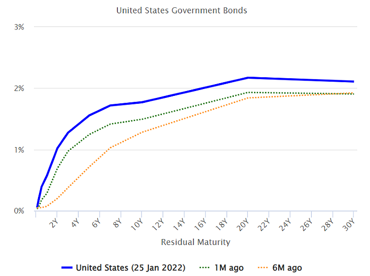 資料來源:world government bonds,美債殖利率曲線變化,資料截至:2022/01/25