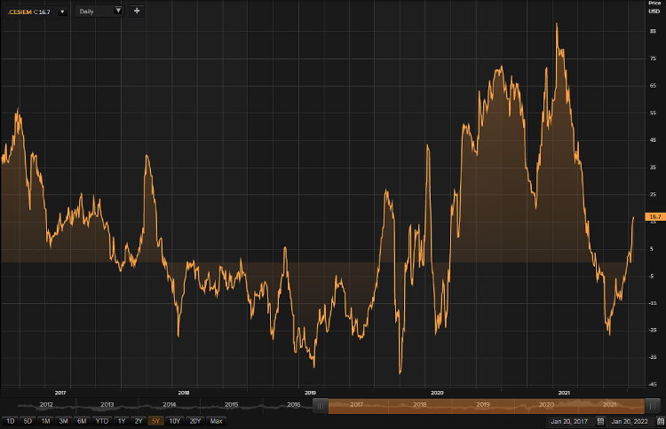 資料來源:Reuters Refinitiv,歐元區花旗驚奇指數,資料截至:2022/01/21