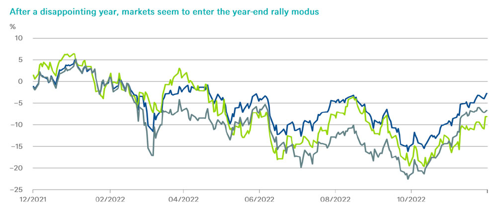 十一月當然不是一帆風順的,但相比前幾個月,感覺不那麼糟了。股市波動度(以S&P500的VIX指數衡量)從10月的高點35降至11月底的20。而追踪美國公債市場隱含波動率、今年尤其緊張的Move Index,本月平均也從150跌至130。本月最重要的發展可能是政府債券殖利率終於出現逆轉。10年期美國國債殖利率從4%以上跌至略高於3.5%,而德國公債殖利率從2.14% 跌至1.93%。這主要是由於美國通膨數據略有好轉,年增率降至7.7%,為1月份以來的最低水平。與此同時,央行行長們竭盡全力向投資者表明,即使通膨可能已經見頂,但問題遠未結束。我們認為央行行長是對的,他們傳達的訊息也很重要,因為市場的自滿可能會產生更好的融資條件,這將不利於對抗通膨。至於讓對抗通膨變得更加困難的則是極其緊張且具有韌性的勞動力市場——美國和歐洲的勞動力和技術勞工短缺問題持續存在。