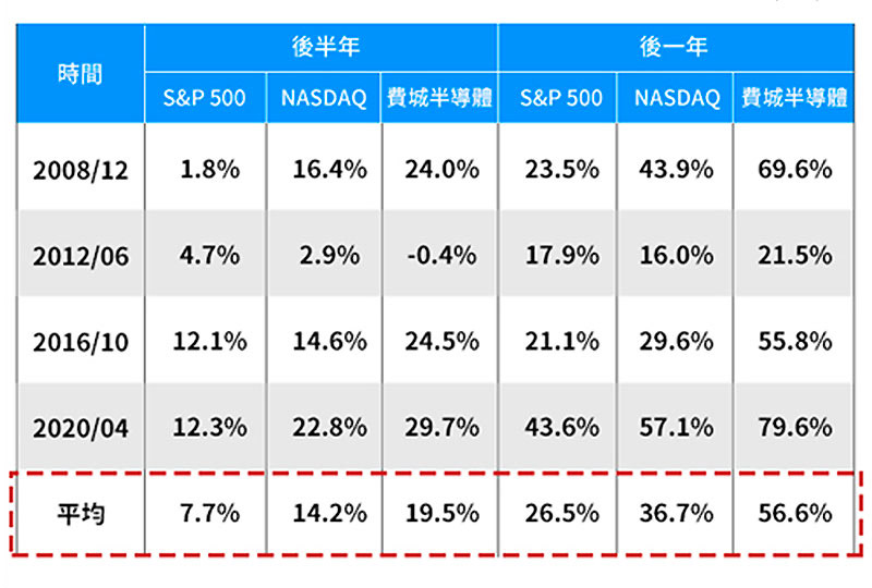 全球經理人持有的現金水位已較去年10月的6.2%高峰連續下滑(如下左上圖), 顯示風險偏好改善,有利美股後市表現。且回顧自2008年金融海嘯以來,經理人持有現金自高檔回落後, 美股三大指數(包含S&P 500、NASDAQ、費城半導體指數)都能受惠於資金回流股市, 後半年與後一年平均漲幅表現出色(如下右下圖)。