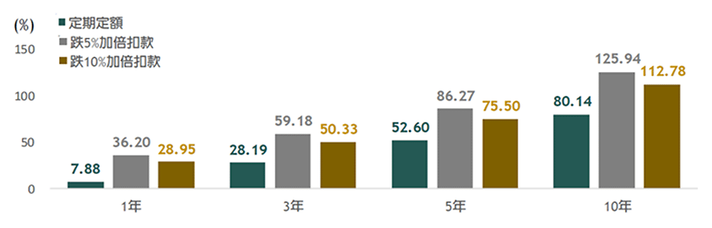 資料來源:Bloomberg、中國信託投信整理,2000/7/31-2023/12/29。自2000/7/31起任一月底開始扣款,每月扣款1次,連續扣1年、3年、5年、10年之結果。此外,若每月定期扣款時帳上績效相較前月下跌5%、10%以上時,則該期投入金額加倍。此資料僅為歷史數據模擬回測,不為未來投資獲利之保證,在不同指數走勢、比重與期間下,可能得到不同數據結果。此為採用胡志明總報酬指數試算之結果,並非代表特定基金之投資成果,亦不代表對特定基金之買賣建議,基金不同於指數,基金可能會有中途清算或合併等情形,投資人無法直接投資指數。