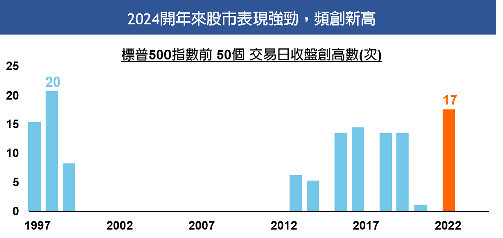 隨著生成式AI發展迅速,相關產業鏈與科技股成為市場追逐焦點,也促使股市2024年創下良好的表現,美股在今年的前50個交易日中,有17個交易日創下收盤新高,是自1998年以來最多的一次。不過,觀察近期盤面表現,上漲已由「七巨頭」逐漸擴展到其他類股,股市上漲的廣度增加,類股出現輪動上的轉變。