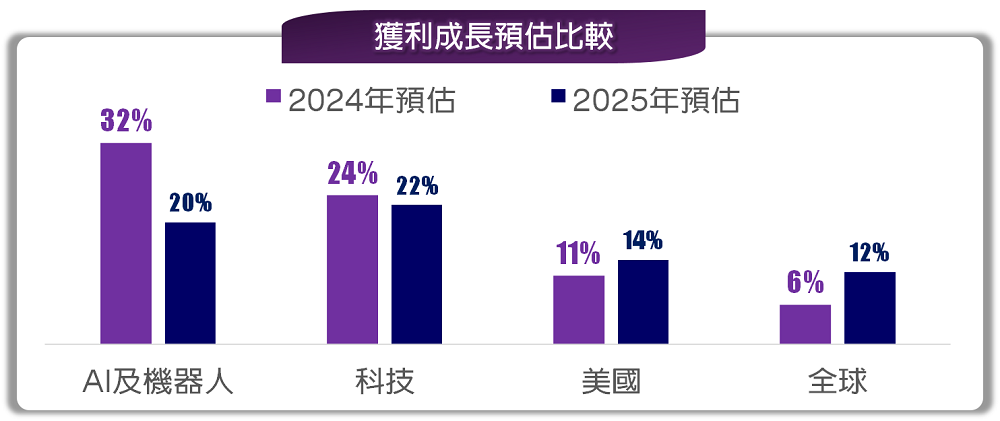 資料來源:Bloomberg,中國信託投信整理,資料時間截至2024/7/9。以上指數均採MSCI系列指數,即MSCI AI及機器人指數、MSCI科技指數、MSCI美國指數、MSCI全球指數,預估數據是採分析師預估之共識; 此資料僅為預估數據,不為未來投資獲利之保證。若內容涉及個股、類股或產業,僅為參考舉例,不代表個股、類股或產業推薦,且不為未來投資獲利之保證,亦不一定為投組未來之持股。投資人申購本基金係持有基金受益憑證,而非本文提及之投資資產或標的。本文提及之經濟走勢預測不必然代表基金之績效,基金投資風險請詳閱基金公開說明書。