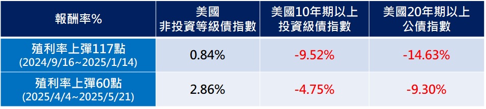 截至五月底,美國非投資等級債殖利率仍有7.46%的水準,高於投資級債與公債的5.21%與4.4%*。此外現階段債市投資最擔心的利率波動問題,也因為美國非投資級債存續期短、僅2.91年,受利率波動影響較小,因此利率上揚時期,不僅抗跌還有機會逆勢上漲,但長天期債動輒就是一成左右的下跌修正。