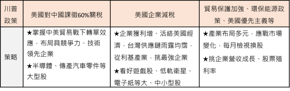 在金融股方面,若川普實施高關稅政見,將產生通膨惡化疑慮,預期FED對未來降息政策採取更為謹慎的態度,將使長天期美債殖利率長期走升,可能將壓縮金融業原先預期降息債券價格上漲而產生的資本利得獲利空間,但本業獲利優異的金融業則不受影響。傳產類股方面,雖對汽車產業建立關稅壁壘,強化美國在地廠商,台廠汽車零組件供應商生產地多在中國和台灣等地,除了在兩岸有生產基地外,另在北美設廠就近供應當地客戶,此外台廠更有許多具國際競爭力的企業,例如文創產業的遊戲股、低軌衛星台灣供應鏈有未來長線商機、電子紙技術全球首屈一指,可藉由三檔台股主動型基金一次打包川普時代下的潛力股票。